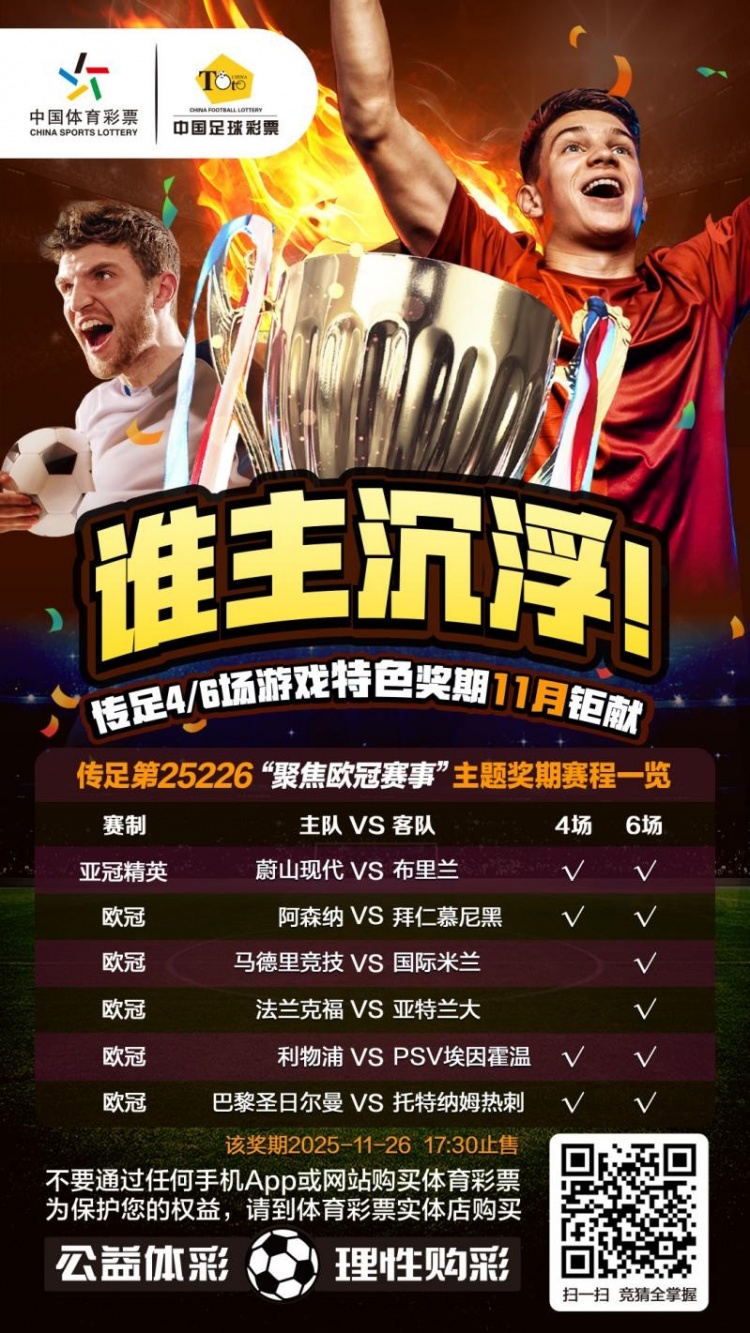 第25226期传足4/6场游戏特色奖期已经于2025年11月23日20:00开售,将于2025年11月26日19:45停售,并于11月27日开奖,其中蔚山现代VS布里兰、阿森纳VS拜仁慕尼黑、利物浦VS PSV埃因霍温和巴黎圣日尔曼VS托特纳姆热刺为4场进球游戏竞猜赛事。